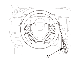 Attach a commercially available spring scale (A) to the steering wheel. With the engine idling and the vehicle on a clean, dry floor, pull the scale as shown, and read it as soon as the tires begin to turn. |